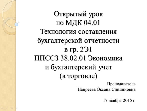 Дисциплина: МДК 04.01 Технология составления бухгалтерской отчетности