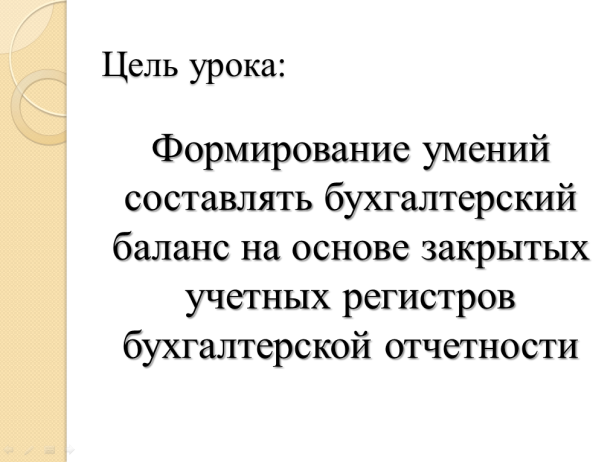 Цель данного урока: Способствовать формированию умений составлять бухгалтерский баланс на основе закрытых учетных регистров бухгалтерской отчетности.