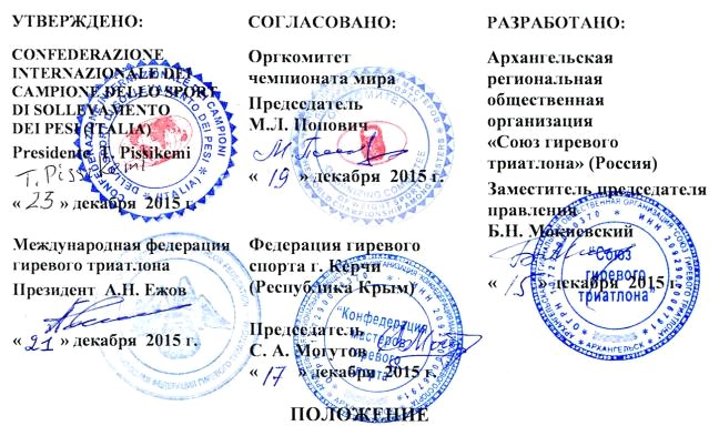 CONFEDERAZIONE INTERNAZIONALE DEI CAMPIONE DELLO SPORT DI SOLLEVAMENTO DEI PESI (ITALIA) Presidente T. Pissikemi « » декабря 2015 г. Международная федерация гиревого триатлона Президент « » декабря 2015 г. | Оргкомитет Председатель « » декабря 2015 г. Федерация гиревого спорта г. Керчи (Республика Крым) Председатель « » декабря 2015 г. | Архангельская «Союз гиревого Заместитель председателя « » декабря 2015 г. |