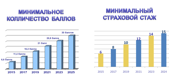 Для расчета страховой пенсии по старости по новым правилам впервые вводится понятие «индивидуальный пенсионный коэффициент» (пенсионный балл), которым оценивается каждый год трудовой деятельности гражданина. Чтобы получить право на назначение страховой пенсии по старости, необходимо иметь 30 пенсионных баллов, однако эта норма в полной мере начнет действовать с 2025 года, а в 2015 году достаточно будет иметь 6,6 баллов.