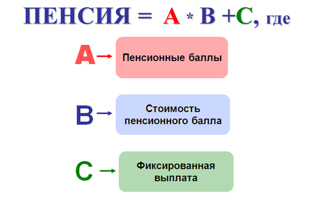 Общий размер получаемой нынешними пенсионерами пенсии состоит из фиксированной выплаты и страховой пенсии. Фиксированная выплата – это установленная законом в твердом размере сумма, которая гарантированно выплачивается к страховой пенсии. Страховая пенсия зависит от количества баллов и его стоимости. Иными словами, сумма, полученная после сложения пенсионных баллов, умноженных на стоимость балла, и фиксированной выплаты, определяет размер пенсии.
