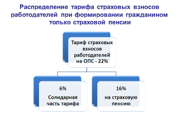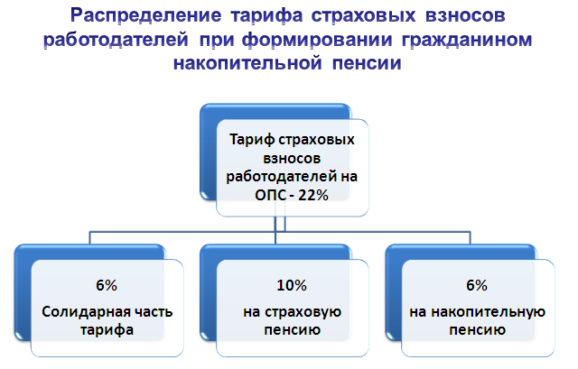 Каким образом будет происходить распределение тарифа страховых взносов, который работодатель отчисляет за своих работников? Работодатель перечисляет в ПФР страховые взносы по общему тарифу 22% от начислений. Эти средства распределяются следующим образом: 6% поступают на так называемую солидарную часть (эти средства не отображаются на индивидуальном лицевом счёте гражданина), 16% – на индивидуальный лицевой счет гражданина. Для лиц 1967 года и моложе эти 16% распределены следующим образом: 6% – на накопительную и 10% – на страховую пенсию.