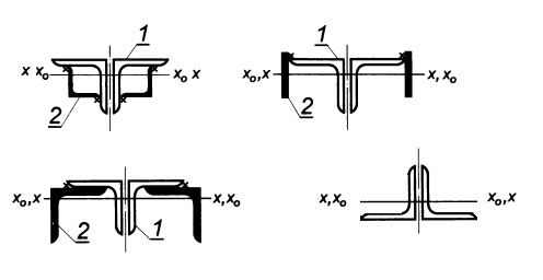 При усилении стропильных ферм путем увеличения сечений стержней следует стремиться к сохранению центровки в узлах ферм. Если в результате усиления расцентровка превышает 1,5% высоты сечения стержня, необходимо рассчитывать стержень с учетом момента от эксцентричного прикрепления в узле. При усилении сжатых стержней элементы усиления целесообразно располагать таким образом, чтобы максимально увеличить радиус инерции сечения, при этом их можно не заводить на фасонки, если обеспечена прочность неусиленного сечения. Элементы усиления растянутых стержней заводят на фасонки на длину, достаточную для передачи воспринимаемой ими части усилия. Совместная работа усиливаемого элемента и дополнительных усиливающих деталей обеспечивается креплением в виде сварных швов. Наиболее предпочтительными вариантами усиления элементов из парных уголков с точки зрения расцентровки изображены на рисунке 9.