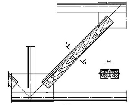Для усиления опорных узлов (с недостаточной несущей способностью по поперечной силе) ферм рекомендуются металлические предварительно напряженные затяжки. Для понимания идеи усиления рассмотрим частный случай: имеется полный доступ к опорному узлу, за счёт того, что опирание плит покрытия осуществляется через стойки-посредники. (рис. 1).