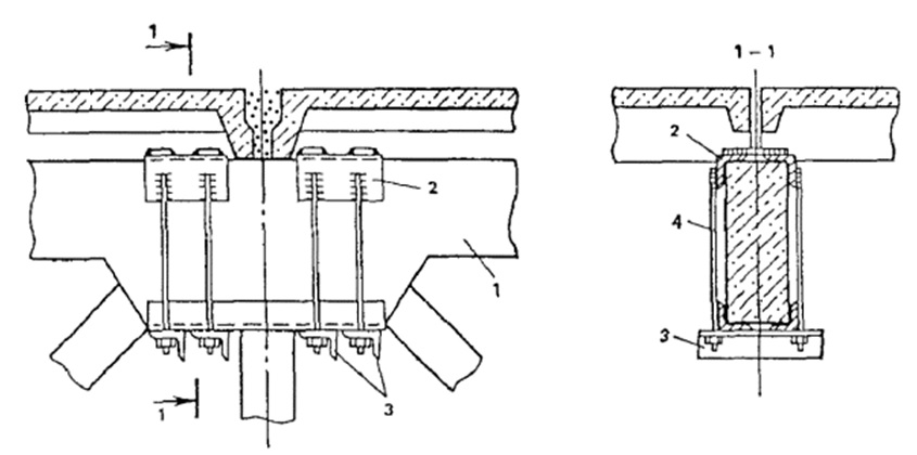 Перед установкой каких либо усиляющих конструкций необходимо зачистить шлиф-машинкой или пескоструйной машиной горизонтальные поверхности узла, в случае, когда это сделать невозможно выполняется набетонка сверху и снизу. После вышеперечисленных процедур можно устанавливать элементы усиления (рис. 1). Предварительное напряжение достигается закручиванием гаек снизу.