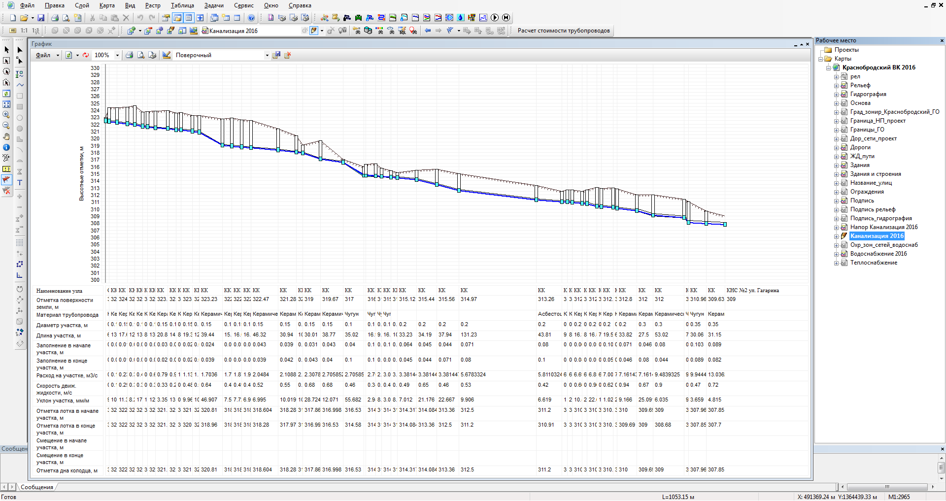 Рис. 2.4. Пример отображения продольного профиля канализационной сети