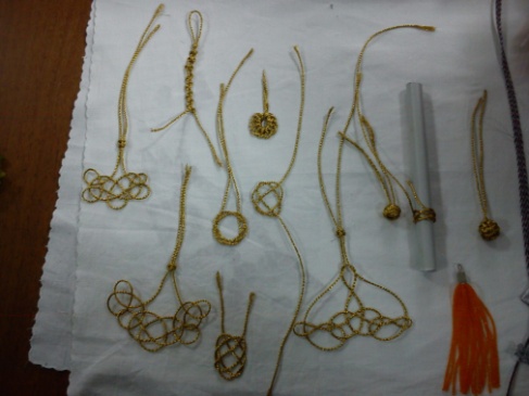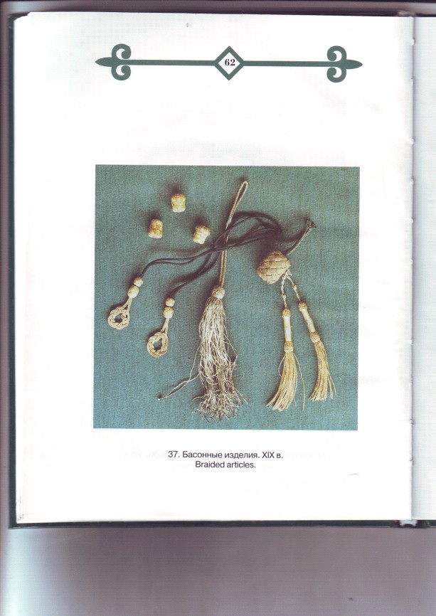 И, последний вид – плетение басонных изделий (тесьмы «уагъэ», кистей «кIыцэ цIыкIу», шариков «дэнлъэч». подвесок) (Рис. 11-17). В золотой вышивке широко применялась тесьма в сочетании с расшитыми элементами в технике « в прикреп». Разнообразные по типу шнурки, имеющие круглое или плоское сечение, плелись наиболее примитивно, без всякого станка, только руками мастериц.