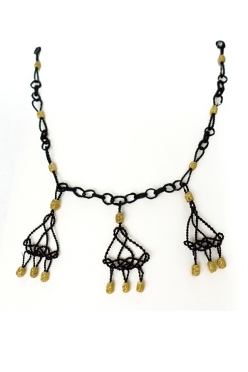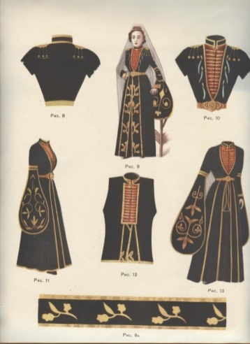 Тесьма, плетущаяся из ниток, особенно золотых, имела иногда вид сложной цепочки и использовалась тогда не для обшивания одежды, а в виде отдельного элемента: шнур для револьвера, шейное женское украшение, шнур для часов. Из них же оплетается крупный шарик – пуговица – чыIу для верхушки женской шапочки, причем основой служит пучок ваты или ниток, оплетенный золотым шнуром. Мелкие кисточки украшают женскую шапочку, спускаясь на шнурке в виде бахромы, прикрывают переднюю часть шапочки. Большой кистью из шелковых и золотых нитей украшается конец мужского башлыка. Таким же шнуром или золотыми и серебряными нитками оплетались часто кисти покупного шелкового платка, образуя шарики.