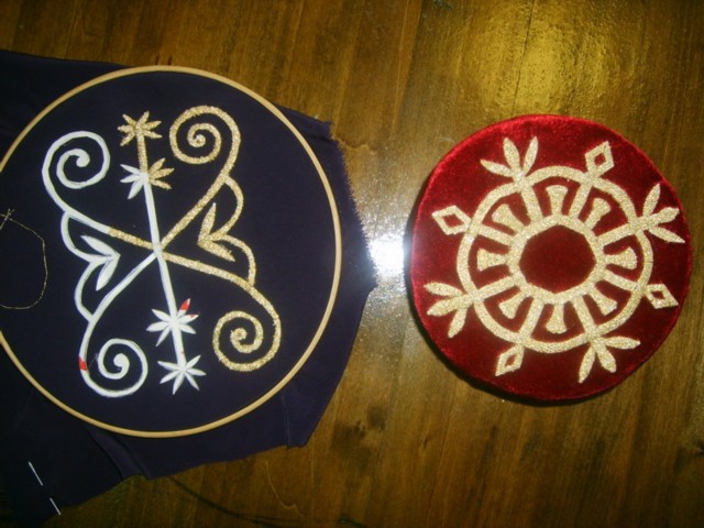 Наиболее ценным и, несомненно, самым старинным был способ шитья «в прикреп» - «дышъэидагъ».(Рис 1-2) На пяльцы натягивали простую белую ткань, на которую при помощи трафарета наносили узор, обводя его ниткой, кусочком мыла или карандашом, чаще всего изображались геометрические фигуры. В границах рисунка, нанесенного на белую ткань, делали настил из тонких шелковых ниток, которые прокладывались параллельными рядами. Настил служил для счета стежков. При шитье золотые и серебряные нити накладывали поперек, прикрепляя тончайшим шелком по краю орнаментального поля стежками снизу к настилу (при золоте – оранжевыми, при серебре – белыми). В результате на готовой вышивке получался мелкий внутренний узор геометрического характера. Шитье «в прикреп» требовало ювелирной точности и большой затраты времени – над кружочком диаметром 5-6 см мастерица трудилась около месяца. Как только вышивка была готова, ее начинали обрабатывать: лицевую сторону вышивки лощили кабаньим клыком или костяной гладилкой, а с изнанки для твердости промазывали клеем. Затем готовый мотив вышивки осторожно вырезали из белой ткани и хранили как заготовку, иной раз по многу лет. Когда приступали к украшению какого – либо изделия, готовые части шитья раскладывались на ткани, подчиняя композицию узора форме будущей вещи. Отдельные элементы вышивки соединялись галуном или шнуром в виде орнамента. Шнуром также окаймляли края вышивки, чтоб прикрыть стежки по краям.