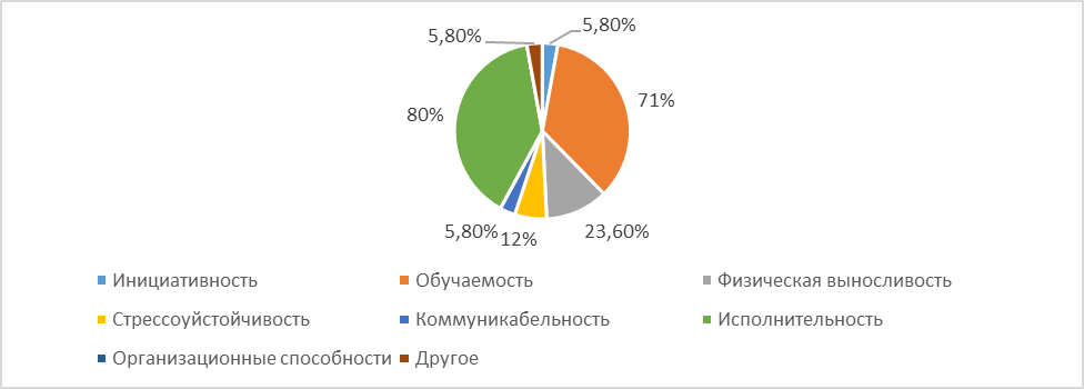Как видим, основными требованиями респондентов к медицинской сестре являются исполнительность (80%) и обучаемость (71%). Почти четвёртая часть опрошенных делают ставку на физическую выносливость (23,6%), необходимость в стрессоустойчивости отметили 12%. Остальные качества, предложенные в нашей анкете (инициативность, коммуникабельность и организационные способности) набрали менее 10%. В графе «другое» респонденты указывали соблюдение норм этики и деонтологии.