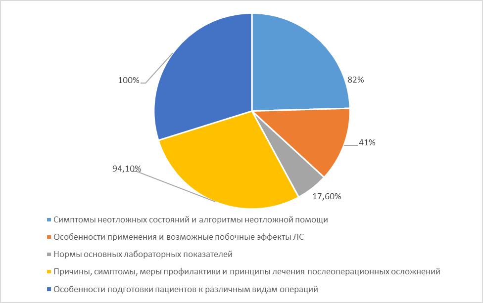 100 % опрошенных требуют от медицинской сестры знаний о подготовке пациентов к различным видам операций. Большинство отметили необходимость в знаниях причин, симптомов, мер профилактики и принципов лечения послеоперационных осложнений (94,1%) и симптомов неотложных состояний и алгоритмов помощи при их развитии (82%). Чуть меньше половины респондентов (41%) считают необходимыми знание медицинской сестрой особенностей применения лекарственных средств и возможные побочные эффекты при их введении и всего лишь 17,6% - знание норм основных лабораторных показателей.