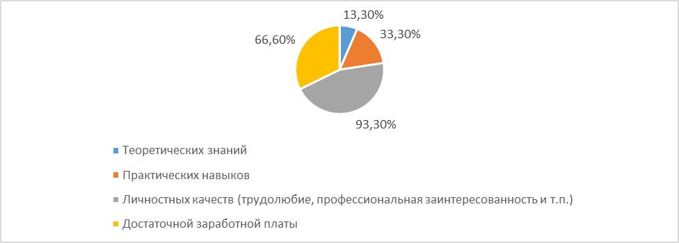 Как видно на диаграмме, 93,3% опрошенных считают, что медицинским сёстрам не хватает личностных качеств для того, чтобы выполнять свои обязанности на «отлично». Интересно то, что при этом лишь 66,6% респондентов считают недостаточный уровень оплаты труда причиной, не позволяющей медицинским сёстрам максимально качественно выполнять свои обязанности. Треть опрошенных специалистов считают, что среднему медицинскому персоналу не хватает практических навыков, и только 13,3% отмечают дефицит теоретических знаний как фактор, влияющий на качество работы медицинских сестёр (рис.5).