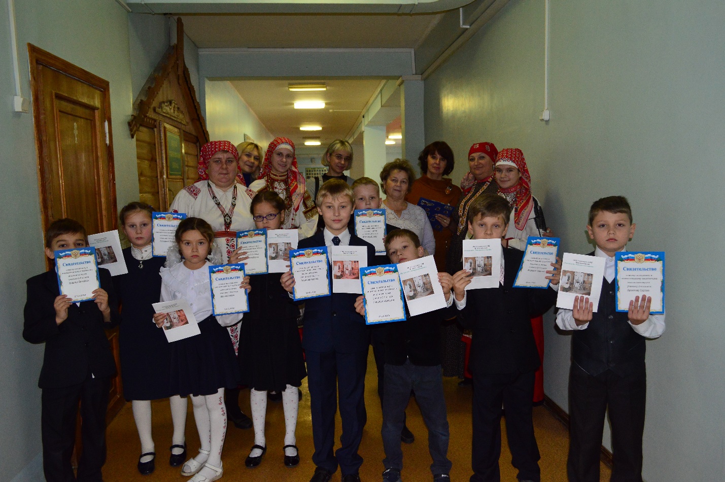 Хозяюшка: Ну что же ребята. Вот и закончилась наша экскурсия. Старое уходит, но его важно знать и беречь. Русская старина вся пронизана добром. Я тоже желаю вам добра и надеюсь, что все, о чем вы сегодня услышали и что увидели, останется в душе у каждого из вас! Всех гостей, которые к нам приходят, мы просим приносить в наш музей старинные вещи, которые мы потом сможем показывать другим гостям. Мы будем рады, если вы принесете в нашу избушку новые экспонаты. (Хозяюшка раздаёт буклеты, свидетельства).До свидания, до скорых встреч!