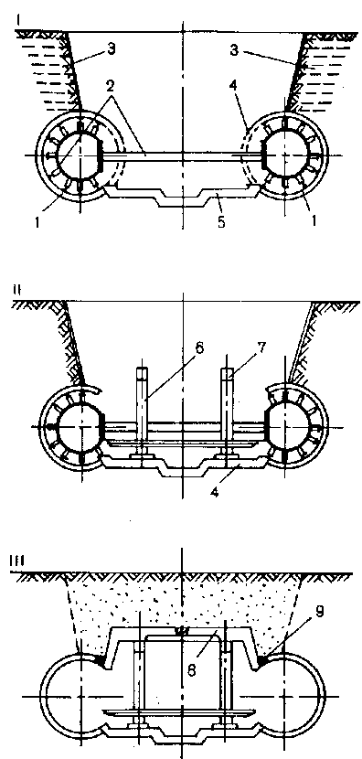 Последовательность выполнения работ по сооружению станции показана на рис. 2.2. Путевые тоннели станции сооружают проходческими щитовыми комплексами перегонных тоннелей. Затем в этих тоннелях устанавливают временное подкрепление в виде рам или специального распорного устройства, после чего приступают к сооружению платформенной части станции. Для этого между тоннелями разрабатывают котлован со стержневым креплением откоса, демонтируют тюбинги временного заполнения обделки путевых тоннелей и устраивают плиту основания.