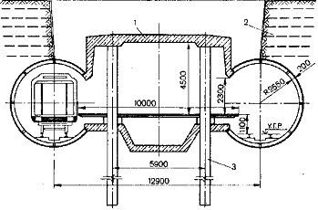 Избежать сложной распорной системы подкрепления путевых тоннелей позволяет конструкция станции, показанная на рис.2.3. Ее конструктивная форма мало отличается от рассмотренные выше, но особенность производства работ при сооружении этой станции позволяет обойтись без сложной системы временах подкрепления путевых тоннелей. Колоннами такой станции служат буронабивные сваи, основание которых заглубляют ниже лотковой плиты. Величину заглубления определяют из расчета несущей способности буронабивной сваи в данных инженерно геологических условиях. На сваи-колонны опирается перекрытие, консольные выступы которой омоноличены с обделкой путевого тоннеля через специальные элементы, входящие кольца обделки путевых тоннелей. Таким элементом может служить замковый тюбинг железобетонной обделки, выполненный без спинки, или специально изготовленный стальной элемент, наружные размеры которого соответствуют стандартному замковому тюбингу обделки путевого тоннеля. Жесткую связь обделки с консолью плиты перекрытия обеспечивает арматура плиты, пропускаемая внутрь замкового тюбинга, который затем заполняют бетонной смесью.