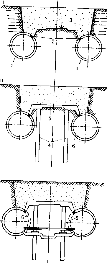 Котлован между тоннелями разрабатывают вдоль оси станции захватками по 20-30 м. На этих участках по мере углублен котлована демонтируют тюбинги временного заполнения кольца, в створе с которым будут расположены жесткие замкнутые рамы. Дойдя до отметки лотка станции, бетонируется обратный свод. Затем поперек станции устанавливают жесткие замкнутые рамы так, чтобы консольные части ригелей зашли в прорези, образовавшиеся при демонтаже колец, под балки-перемычки. Стыки элементов рам омоноличивают. По рамам укладывают плиты перекрытия и производят обратную засыпку. Только после обратной засыпки демонтируют оставленные между рамами тюбинги временного заполнения обделки путевых тоннелей. Новые возможности для выбора оптимальных конструктивных и технологических решений при полузакрытом способе сооружения станции открываются при использовании конструктивной схемы односводчатой станции, обделка которой представляет собой пологие верхний и обратный своды, опирающиеся на массивные опоры кругового очертания. В определенных условиях обратный свод может быть заменен лотковой плитой. Полые опоры свода выполнены из монолитного бетона в тоннелях, пройденных перегонными щитовыми комплексами. На рис. 2.7 представлены варианты такой конструкции с монолитным (а) и сборным (б) исполнением верхнего свода.