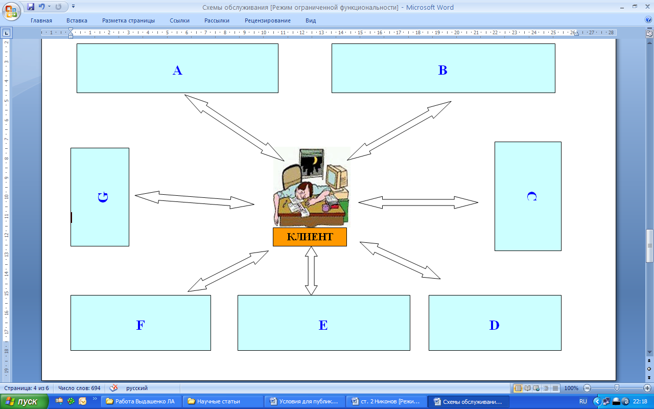 Рис 1. Схема взаимодействия клиента с дирекциями и службами дороги: A, B, C, D..- подразделения железной дороги по обеспечению