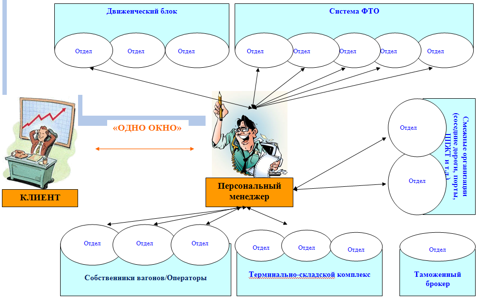 С точки зрения процессного подхода и целевой направленности существующая организационная структура железнодорожного транспорта удовлетворяет заданным условиям, но противоречие возникает на стыке работы с клиентом, т. е. направленности на потребителя транспортных услуг.