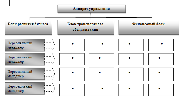 В соответствие с функционалом единиц структуры фирменного транспортного обслуживания персональным менеджерам отводится роль инициаторов проектов (программ) по совершенствованию транспортного обслуживания. Менеджер по работе с ключевыми клиентами занимается поддержанием отношений с самыми важными для компании клиентами, формирует коммерческие предложения, проводит первичную презентацию и последующие встречи, заключает договоры от имени компании. Он принимает участие в разработке ценовой политики, решает вопрос о скидках или особых условиях для клиента, а также контролирует процесс и сроки перевозок, соблюдение договоренностей.