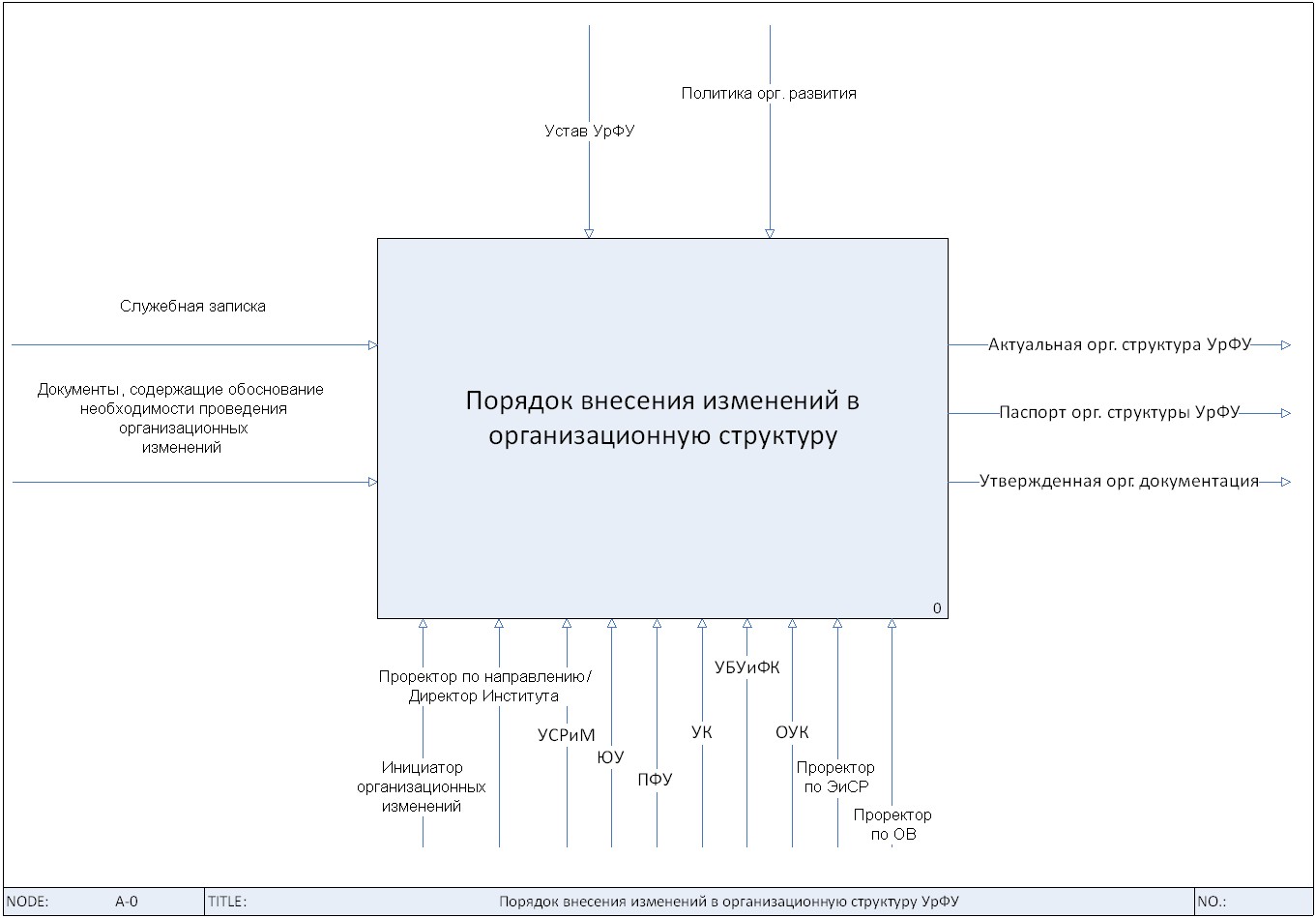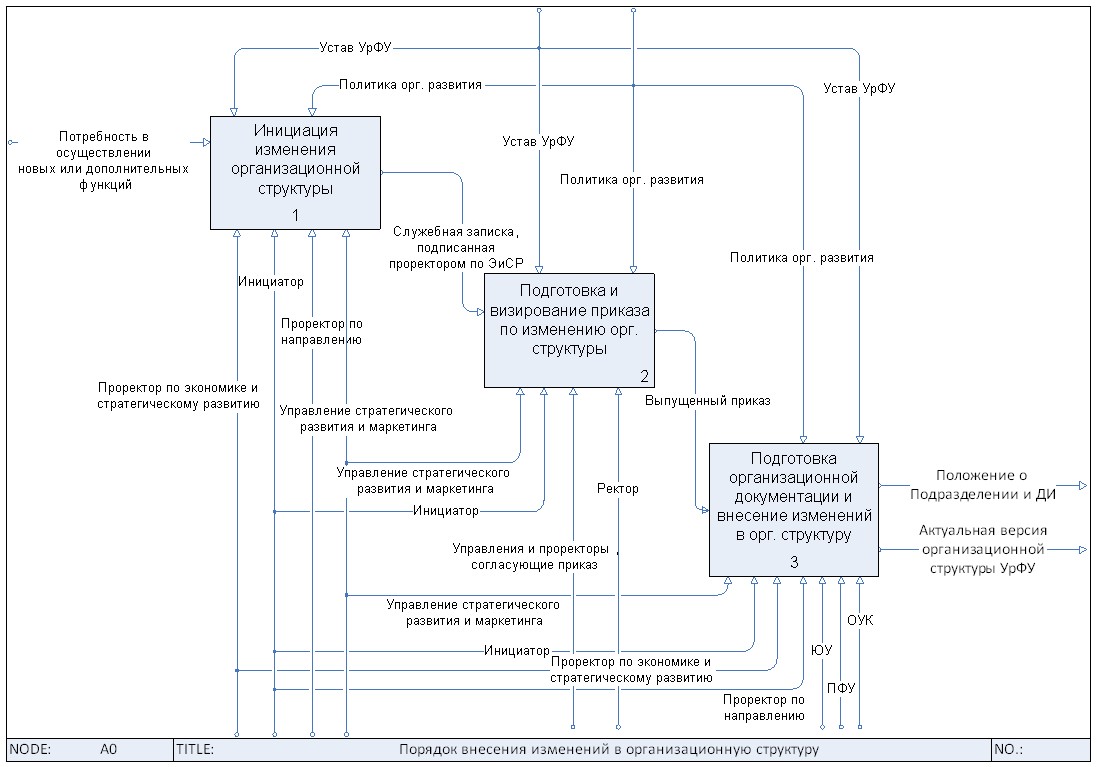 Выход: Актуальная организационная структура Университета; Паспорт организационной структуры УрФУ; Утвержденная организационная документация (вновь разработанная либо измененная с учетом соответствующих организационных преобразований), регламентирующая деятельность структурных подразделений и работников Университета.