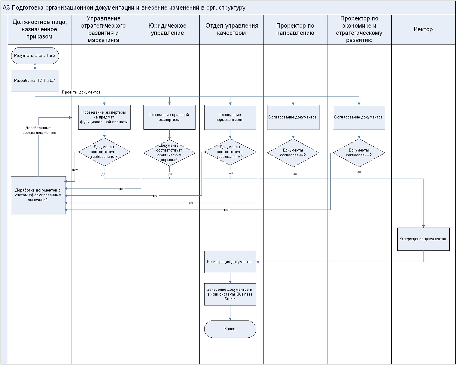 ЮУ осуществляет правовую экспертизу с целью исключения юридических рисков; ОУК проводит нормаконтроль и проверку оформления документов на соответствие требования документации СМК; Проректор по функциональному направлению; Проректор по ЭиСР. При наличии замечаний документы направляются разработчику для внесения соответствующих изменений. |
