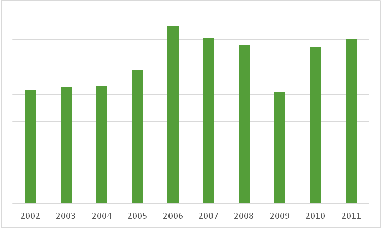 Диаграмма 2. Спрос на трубные марки HDPE в Северной Америке в 2002-2011гг., тыс. тонн