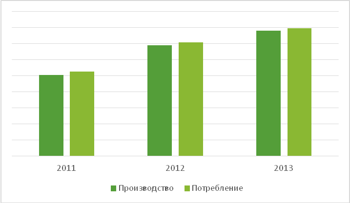 В последние годы прирост потребления обеспечивается отечественными производителями, в 2011-2013 годах их доля превысила 80%, продемонстрировав максимальный показатель за последние годы.