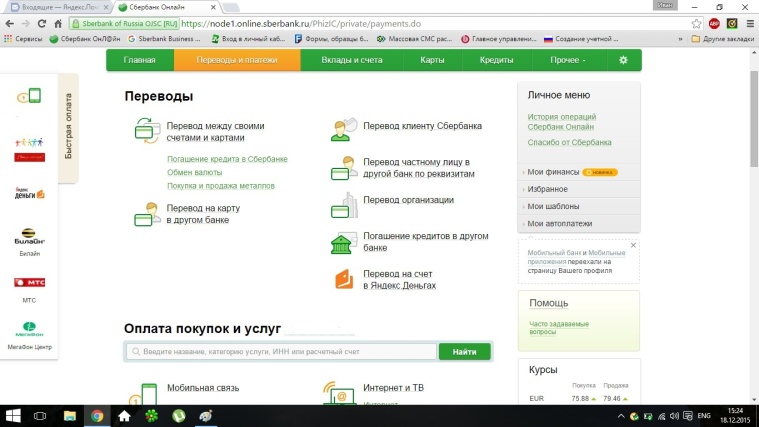 3. На сайте СберБанка Онлайн заходим в личный кабинет, далее находим кнопку Платежи и переводы и нажимаем