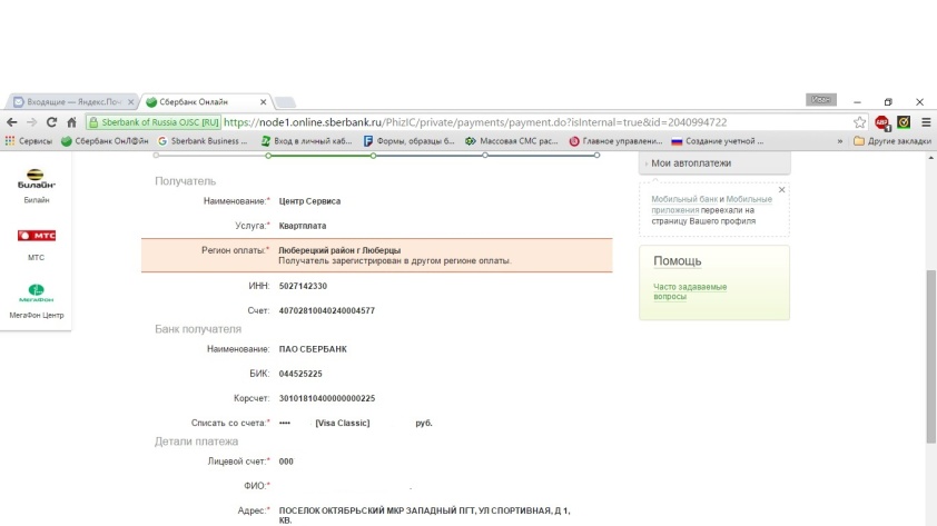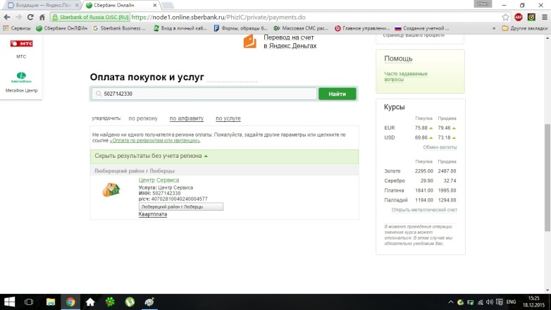 4. В строке оплата покупок и услуг в поиске набираем ИНН организации, Сервиса» 5027142330 и нажимаем поиск, после чего появившемся поиске жмем на ссылку Сервиса»