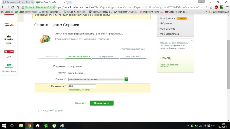 5. В появившемся окне выбираете счет карты, и набираете свой ФЛС нажимаете продолжить