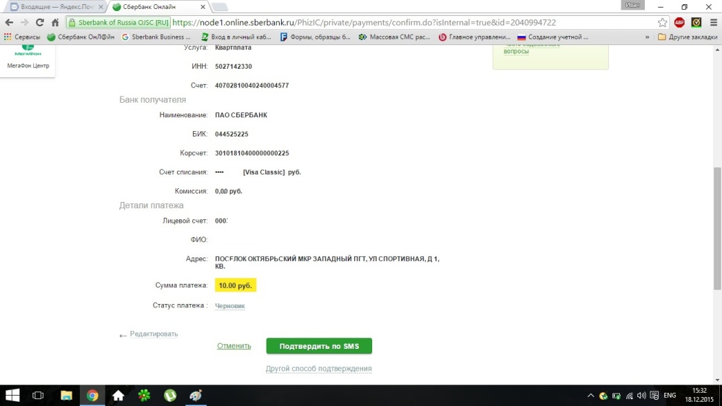 8. В итоги проверяем все свои данные и сумму платежа и нажимаем кнопку подтвердить по SMS.