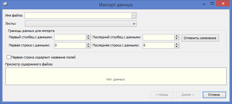 Шаг 1. На первом шаге работы с мастером импорта необходимо, прежде всего, в поле «Имя файла» выбрать файл MS Excel для импорта (см. рис. 11).