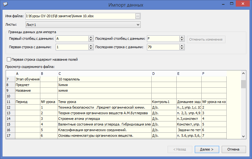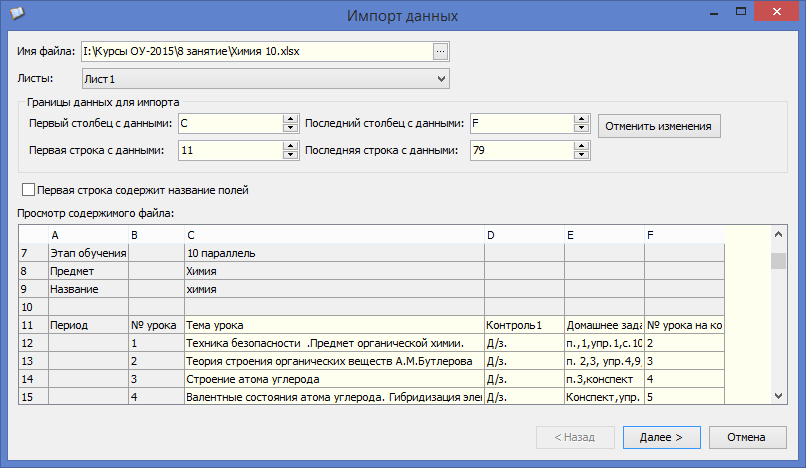 После этого мастер импорта проанализирует информацию, находящуюся в файле MS Excel, и отобразит его содержимое в разделе «Просмотр содержимого файла» окна импорта (Рисунок 12).