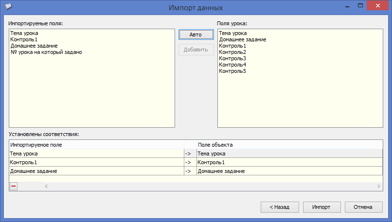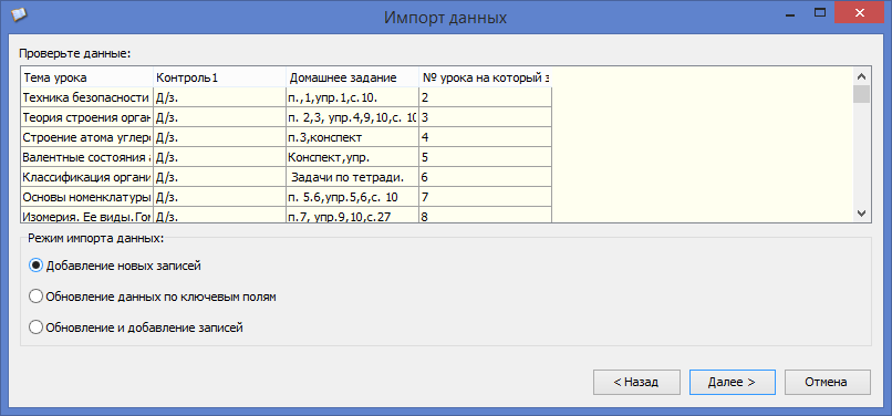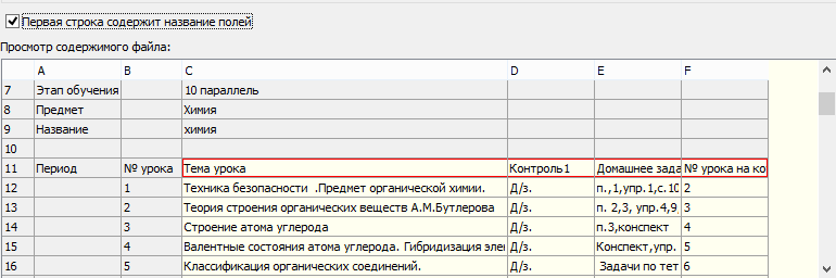 Импорт ПТП из файла ExcelРежим импорта поурочно-тематических планов настроен на импорт из стандартного шаблона. В таблице для импорта обязательно должны присутствовать следующие столбцы: «Тема урока», «Домашнее задание», «Контроль1». При этом тема урока является обязательной для заполнения, столбцы домашнее задание и контроль могут быть не заполнены. Следует отметить также, что в зоне данных для импорта не должно быть объединённых ячеек.