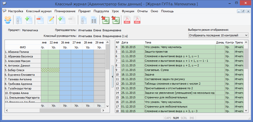 Для создания ПТП можно использовать заполненный классный журнал, приложение позволяет создать план из уроков, введённых в правую часть журнала. Для этого следует: