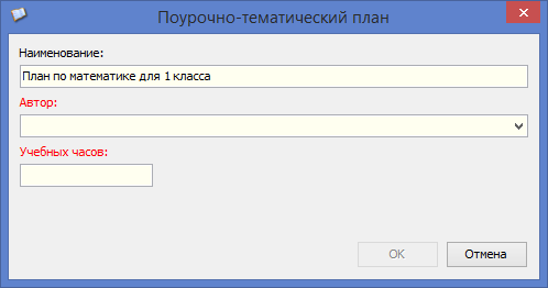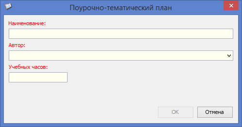 В окне «Поурочно-тематические планы» при помощи кнопок (Ошибка: источник перекрёстной ссылки не найден7) или пунктов меню «Добавить», «Удалить» можно добавлять или удалять ПТП. При создании ПТП нужно заполнить обязательные поля: наименование, автор и количество учебных часов (Ошибка: источник перекрёстной ссылки не найден8).