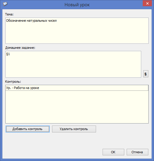 При добавлении нового урока в план нужно заполнить тему, домашнее задание, а также сформировать список контролей (Ошибка: источник перекрёстной ссылки не найден10).