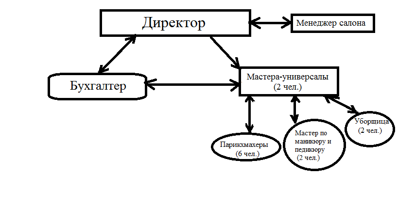Из схемы, представленной выше можно заметить, что в салоне «Стиль» работают: 2 мастера-универсала, 6 парикмахеров, 2 мастера по маникюру и педикюру, а также 2 уборщицы. Директор салона исполняет обязанности администратора и у него в подчинении находятся как бухгалтер, так и непосредственно менеджер салона.