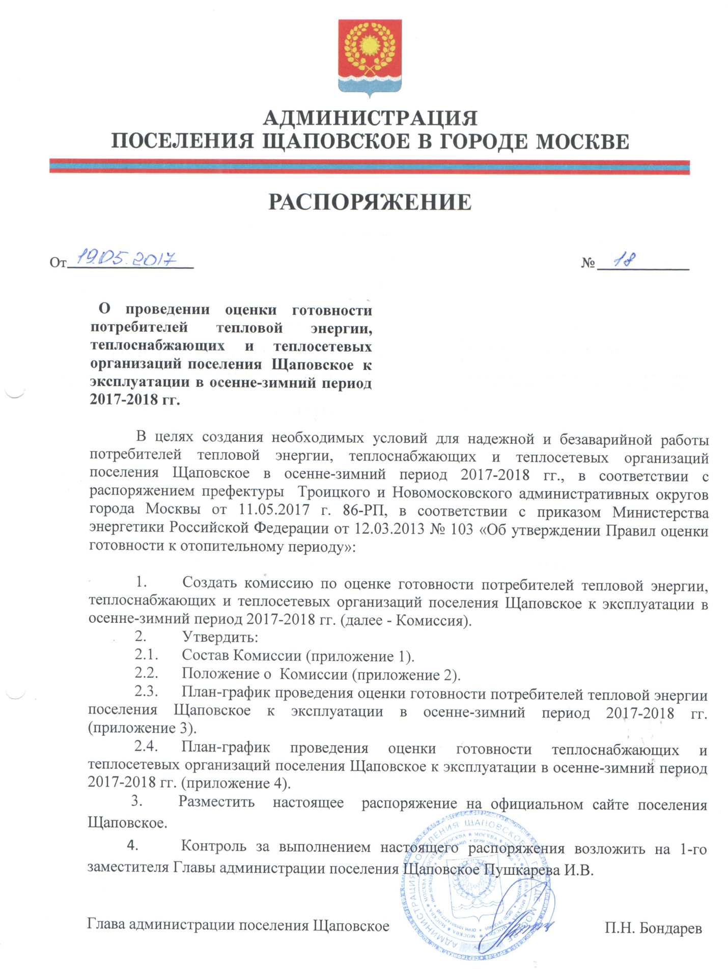 1.1. Комиссия по оценке готовности потребителей тепловой энергии, теплоснабжающих и теплосетевых организаций Троицкого и Новомосковского административных округов города Москвы к эксплуатации в осенне-зимний период 2017-2018 гг. (далее - Комиссия) создана для оценки готовности к эксплуатации в осенне-зимний период потребителей тепловой энергии, теплоснабжающих и теплосетевых организаций поселения Щаповское.
