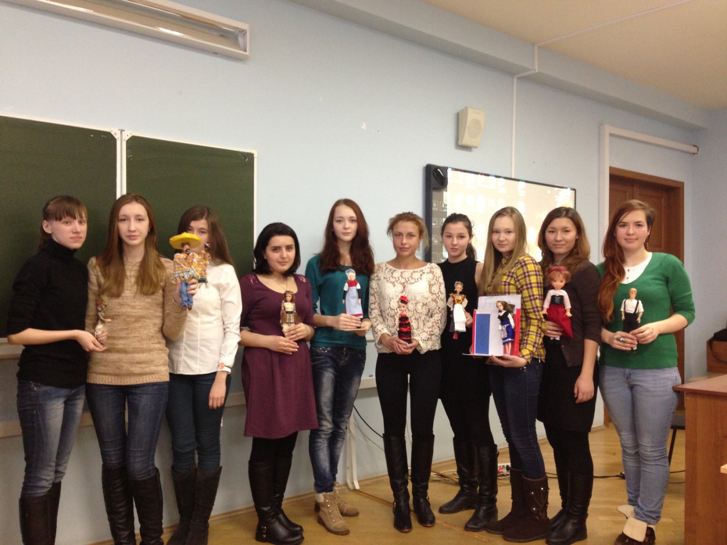 Первый опыт участия в студенческом конкурсе получили первокурсники, обучающиеся на направлении «Лингвистика. Перевод и переводоведение». Каждая подгруппа самостоятельно подготовила куклу в национальном костюме страны изучаемого языка и рассказала об истории создания национального костюма, нравах и обычаях этой страны. Первое место в данном конкурсе досталось группе 04.4-307 за баварский костюм мужчины и женщины. На второе место вышла подгруппа 04.4-305 (б), создавшая куклу ручной работы в швейцарском костюме. Третье место заняла подгруппа 04.4-306 (б) и их исполнение французского костюма. После конкурса все куклы были выставлены в витрины на втором этаже отделения, где также можно увидеть красивых кукол в костюмах Испании, Англии, Мексики, Италии, Ирландии, Шотландии, Уэльса.