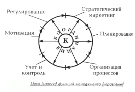 Процессный подход рассматривает функции менеджмента как взаимосвязанные. Процесс управления является цепью непрерывных взаимосвязанных действий по стратегическому маркетингу, планированию, организации процессов, учету и контролю, мотивации, регулированию. В центре круга — координация работ.