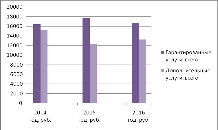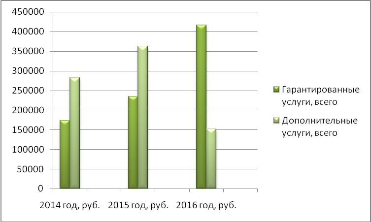 Не смотря на уменьшение обслуженных получателей социальных услуг в 2016 году увеличилось поступление денежных средств от оплаты гарантированных социальных услуг в сравнении с 2015 годом на 180901,35 тыс. руб. (таб.1.1.), дополнительных на 210609,15 тыс. руб. меньше. Уменьшение дополнительных услуг произошло из-за расширения перечня гарантированных услуг.
