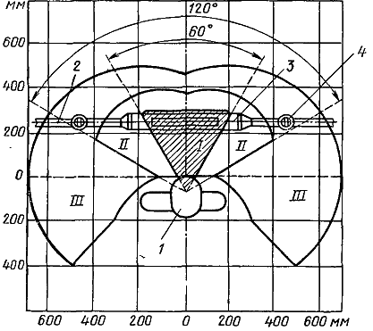 Рис.1. Рабочая зона при установке корпуса соединительной эпоксидной муфты СЭ: / - оптимальная зона для наиболее важных и часто используемых инструмента и приспособлений, // - зона легкой досягаемости для часто используемых инструмента и приспособлений, III - зона для редко используемых инструмента и приспособлений; 1 - электромонтер-кабельщик, 2 - кабель, 3 - соединительная эпоксидная муфта, 4 - приспособление для крепления концов кабелей и соединительной муфты