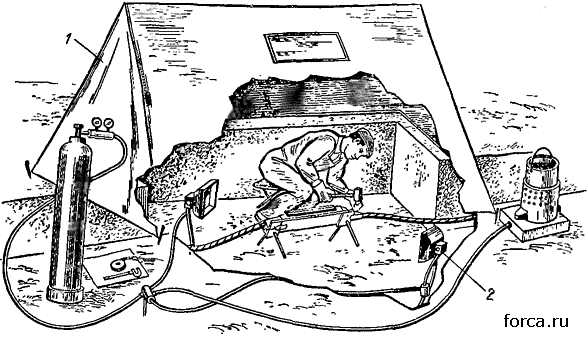 Вблизи от котлована устанавливают две палатки: первая - защищает рабочее место с разделываемыми концами кабеля от влаги, пыли и солнечной радиации, во второй - разогревают припой, заливочные массы, подготовляют эпоксидные компаунды и т. д. Палатки устанавливают так, чтобы вход в них находился с подветренной стороны.