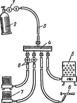 Рис.4. Схема распределения пропан-бутана в рабочей зоне: 1 - редуктор, 2 - баллон с газом, 3 - шланг, 4 - распределительная рампа, 5 - газовая жаровня, 6 - газовая горелка, 7 - горелки инфракрасного излучения, 8 - редуктор