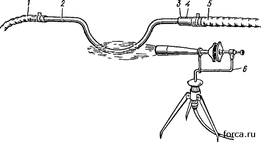 Наибольшее распространение для прогрева концов кабеля с пластмассовой изоляцией получила установка, показанная на рис.5. На конец кабеля надевают прорезиненный шланг 5, диаметр которого в 1,5 раза больше диаметра кабеля, а длина 2 м. К свободному концу шланга с помощью муфты 3 присоединяют стальную трубу 2 и резиновый шланг 1, подключенный к компрессору. От компрессора воздух проходит к кабелю, обтекая его в прорезиненном шланге. Предварительно воздух прогревают в трубе газовой горелкой 6. Контроль за температурой нагретого воздуха осуществляют термометром, установленным в отверстии 4.