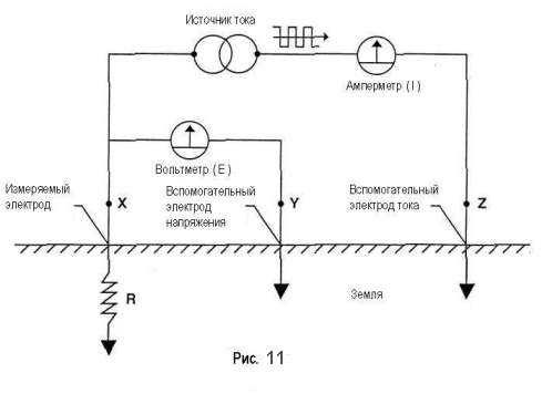 Вольтметром измеряется напряжение между штырями X и Y и амперметром - ток, протекающий между штырями X и Z (см. рис.11).