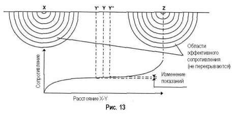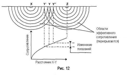 Для точного измерения сопротивления заземления размещать вспомогательный электрод тока Z достаточно далеко от измеряемого электрода для того, чтобы потенциал на вспомогательном электроде напряжения Y измерялся за пределами зон эффективного сопротивления как проверяемого электрода X, так и вспомогательного электрода тока Z. Наилучшим способом проверить, находится ли электрод за пределами зон эффективного сопротивления остальных электродов, будет проводить измерения, меняя его местоположение. Если вспомогательный электрод напряжения Y находится в зоне эффективного сопротивления одного из остальных электродов (или одновременно в обеих зонах, если зоны перекрываются), то при смене его местоположения показания прибора будут значительно меняться и в этом случае нельзя точно определить сопротивление заземления (см. рис 12).