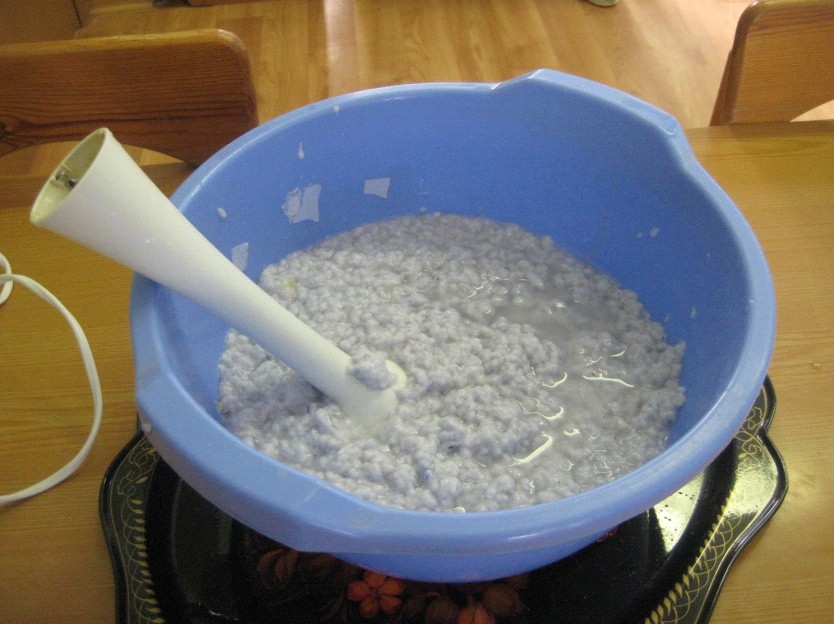 3. Тщательно размяли мокрую бумагу руками и миксером, чтобы получилась однородная влажная масса.