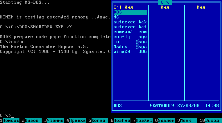 В Norton Commander в подобных оболочках вывод содержимого каталогов осуществляется в так называемых панелях. Панели представляют собой два прямоугольных окна, ограниченных рамкой. Размеры этих окон либо фиксирован и составляет 40*23 (полный размер) и 40*15 (половинный размер) символов, либо зависит от размеров родительского окна (Windows Commander). Любую панель можно выключить, а также можно убрать все панели с экрана и оставить экран MS DOS. В Windows Commander такой возможности нет - в нем каждой приложение, в том числе и приложения DOS, запускается в отдельном окне.